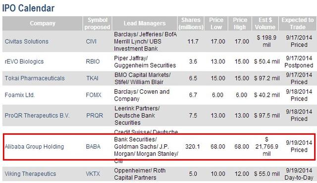 阿里巴巴最初的IPO定价区间是每股60美元至66美元,但本周一被提高到66美元至68美元。